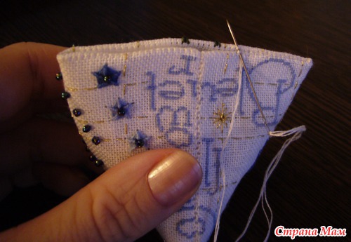 Лучше начинать сшивать снизу, чтобы потом не было необходимости обрывать нитку.