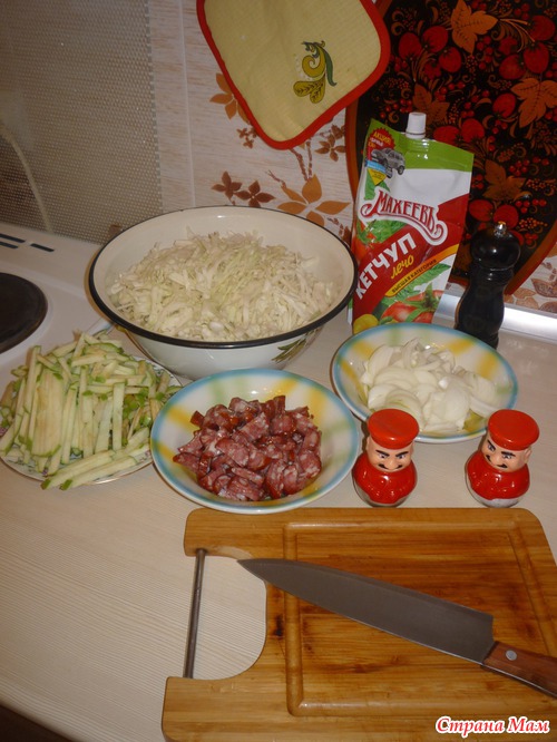 Капусту и лук нарезаем соломкой, колбаски колечками или полуколечками
