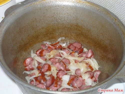 затем добавляем колбаски и обжариваем 2-3 минуты