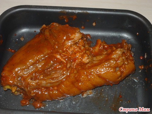 смазываем ее чесночком, специями по вашему вкусу и томатом (я на этот раз смазала аджикой)