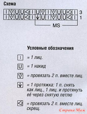 Основной узор: число петель кратно 8 + 6 + 2 кром. Вязать по схеме, на которой приведены только лиц. р., в изн. р. петли и накиды вязать изн., в сдвоенных накидах 2-й накид - лиц. Начинать с 1 кром., повторять петли раппорта, заканчивать петлями после раппорта и 1 кром. Внимание! При убавлениях и прибавлениях число накидов должно соответствовать числу провязанных вместе петель и наоборот. Повторять с 1-го по 4-й р.
