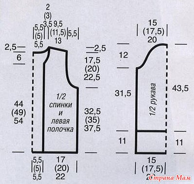 Через 32,5 = 78 р. (35 см = 84 р.) 37,5 см = 90 р. от наборного края закрыть для пройм с обеих сторон 1 х 3 п., затем в каждом 2-м р. 2 х 2 п. и в след. 4-м р. 1 х 1 п. = 54 (62) 70 п.