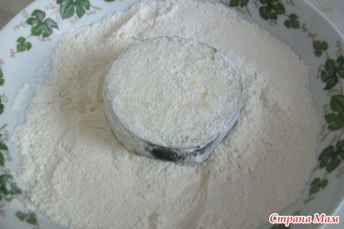 -мешаем муку с солью, обваливаем баклажаны и обжариваем с двух сторон...