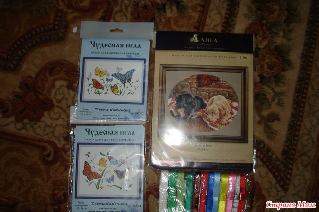 Получила бандерольку с вышивками от Марины Липовки, закупка была Магическая, т. к. фирма называется МАГ))) Я конечно заказывала там больше, чем 3 набора вышивки и набор лент, но в наличии оказалось только вот это