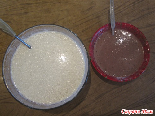 Делим его на пополам и во вторую половину добавляем какао несколько ложек (в зависимости от количества теста) и выпекаем блинчики шоколадные и простые беленькие