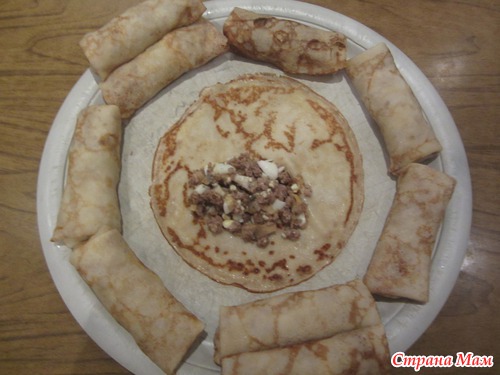 Оставшиеся простые блинчики я нафаршировала фаршем обжаренным с грибочками и луком+ вареное яйцо