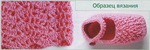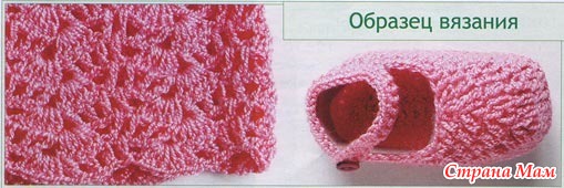 Набрать цепочку из 15 в. п. и вязать узором по схеме 3. Для выполнения застежки наметить центральную п. пятки и набрать цепочку из 15 в. п., обвязать ст. б/н, ввести крючок в 7-ю п. перед намеченной п. и вязать ст. б/н до 7-й п. после намеченной. Выполнить эти 30 п. всего 3 р. ст. б/н и закончить вязание. Вторую пинетку вязать так же.