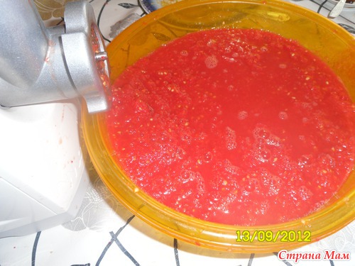 Помидоры очистила от кожуры, прокрутила через мясорубку.