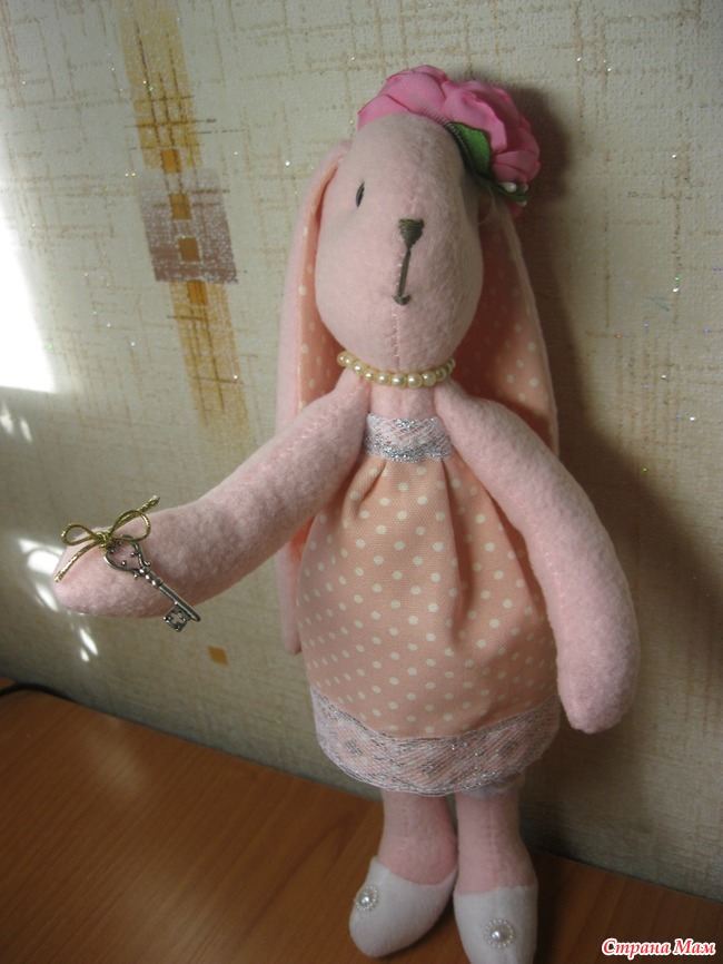 Сшила ее с большим удовольствием!!! Так я их люблю шить и любоватся ими ммммм-моя ушастенькие!!! Рост 35 см, из флиса, набита синтепухом, платье хлопок, кружево... ножки и ручки двигаются... Назвали ее Сонечкой-она большая модница и ключик у неё от шкафа, где весят ее наряды
