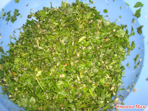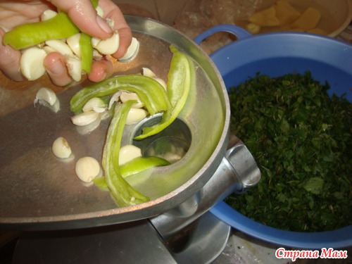 зелень режим, чеснок, и острый перец пропускаем через мясорубку,
