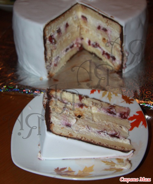 Внутри: апельсиновый бисквит + крем из сливок, маскарпоне и рикоты + вишня + карамелизованные орехи + ганаш (выравнивание)