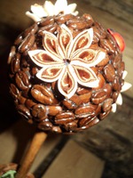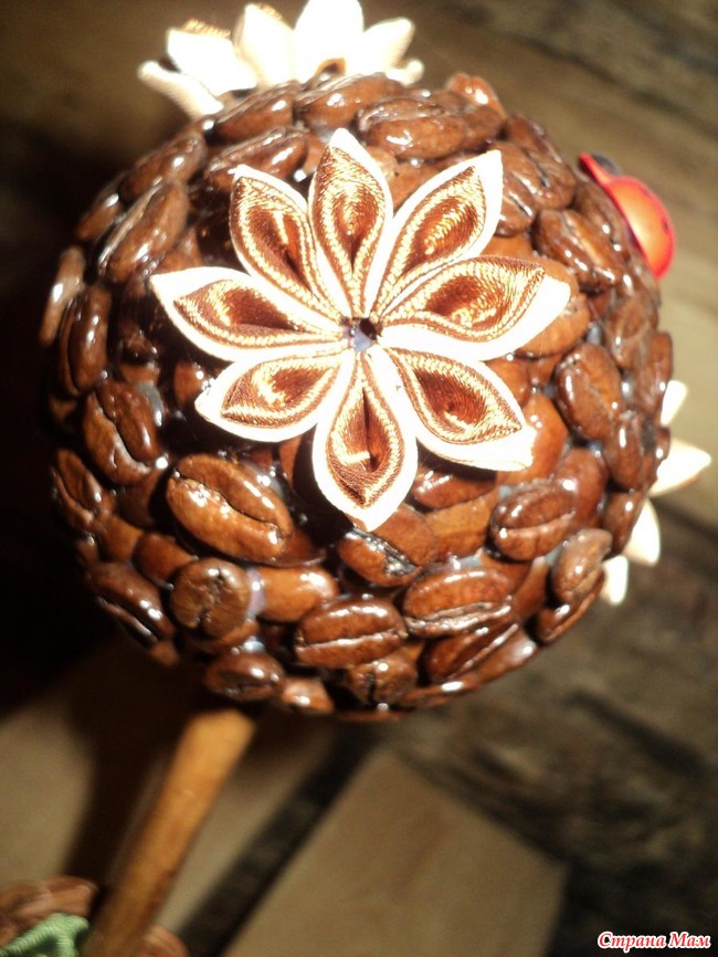 К тому же это деревце я по верх покрывала лаком. Запаха нет, но за то как блестят зерна кофе на солнце