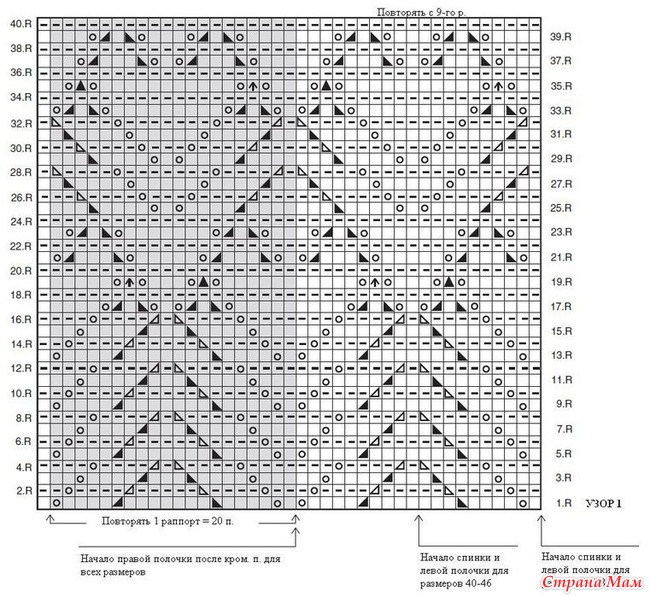 Узор 1: 1 раппорт = 20 п. = 8 см в ширину / 26 р. = 10 см в высоту;