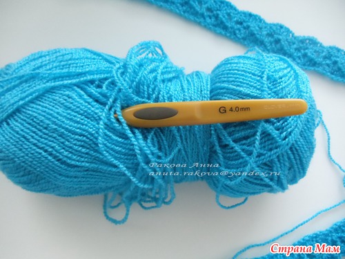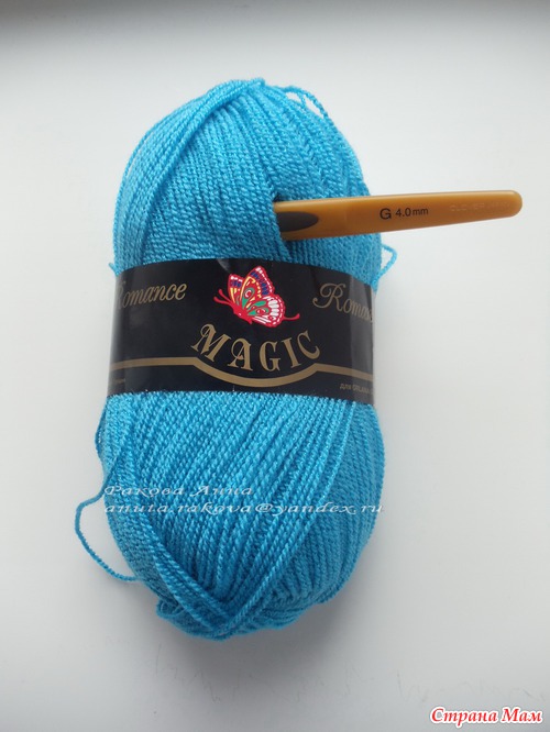 Пряжа у меня тонкий акрил с метанитом, 400м на 100гр. цвет Бирюза, Крючок Кловер 4 мм. (фото будет завтра)