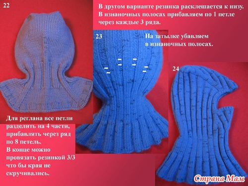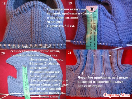 После того как резинка готова, начинаем вязать клин как сверху, также делим по полам и в середине делаем убавки и одновременно по бакам прибавки. См рисунок автора 18 этап. Вяжем по кругу 6 см не забывая делать убавления на затылке. По достижения нужной длины, переходим на резинку 3 на 3. Должно получится 84 петли или 28 полос ( количество петель должно быть четным!!!). Для большей плотности убавляем во втором ряде по 1 изн петли, в каждой полосе, КРОМЕ КЛИНА ( переда), и вяжем таким образом 6 см, потом прибавляем по одной петле в каждой изнаночной полосе для симметрии. При этом смотрим чтоб слишком узко не стало и пролезла голова.