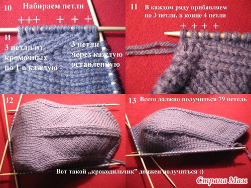 Начинаем набор боковых петель, как на пятке. Вяжем дальше не переворачивая полотно, укороченные ряды вяжутся следующим образом 1 петлю провязываем лиц, поднимаем нить с предыдущего ряда протяжкой петлю, 2 лиц провязываем лицевой, опять из протяжки поднимаем петлю, 3 вяжем лицевой и поднимаем последний раз из протяжки петлю. На спице остается одна петля( четвертая) ее провязываем лиц (начинаем формировать стенки шлема) и сразу поднимаем с боковин по одной петли 3 раза, разворот вяжем по изнанке в обратном направлении и второй угол вяжем аналогично первому, только изнаночными петлями и так же делаем после последней петли набор 3 петель. Таким образом вяжем набирая петли на спицу, в итоге должно получиться 79 петель. И еще момент такой Автор советует для лучшего пролегания к личику шлема последние 6 или 4 петель (которые возле самого лица) лучше набирать по 1 петле за ряд и провязывать по рисунку. Это обеспечит лучшее пролегание ко лбу.