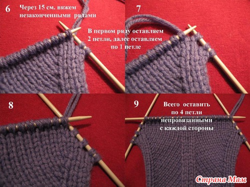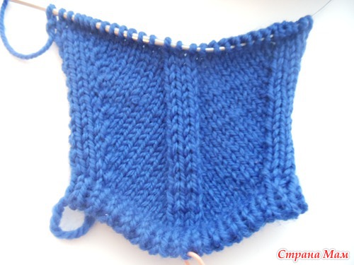 Вяжутся они легко для этого по достижении длины 15 см на этом же ряде не довязываем 2 петли, разворот на изнанку провязываем не доходя 2 петли, разворот на лицевую недовязывая 1 петлю, разворот и вяжу по изнанке недовязывая 1 петлю... так до тех пор пока не будет по 4 петли с двух сторон. И так у нас на спице следующая картина по 4 петли с каждой стороны не провязаные и они немного под наклоном, как у автора на картинке