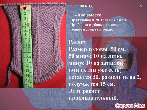 При убавлениях на резинке нужно учесть обхват головы, что бы не было очень туго, а то голова не пролезет. На месте клина я не делаю убавки, мы используем клин для натягивания на носик в холодное время, для этого он должен быть более свободным. Если эта функция не нужна, можно сделать убавки и на клине, но не забывать про объем головы.