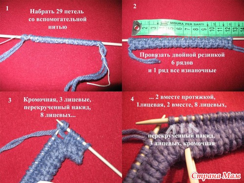 3 - 4 пункты : После двойной резинки провязываете все петли изнаночными петлями. Поворот плотна, 1 кромочная 3 лиц. п. перекрученный накид от себя, 8 лиц. п., 2 петли вместе протяжкой( 1 петлю провязываем 2 протягиваем через первую, что-то вроде две вместе с наклоном в право) 1 лиц, 2 лиц протяжкой влево так же 1 петлю снимаем 2 провязываем и первую протягиваем через вторую, 8 лиц. п, перекрученный накид на себя, 3 лиц. петли, 1 кромочная. Так делать в каждом лицевом ряде( изнаночный вяжем по рисунку, накид провязываем изнаночной петлей).