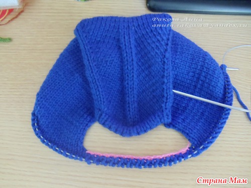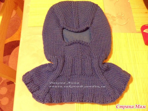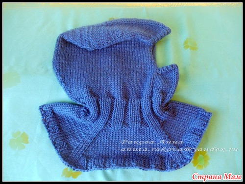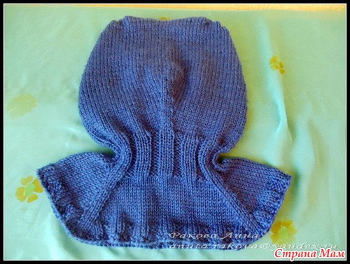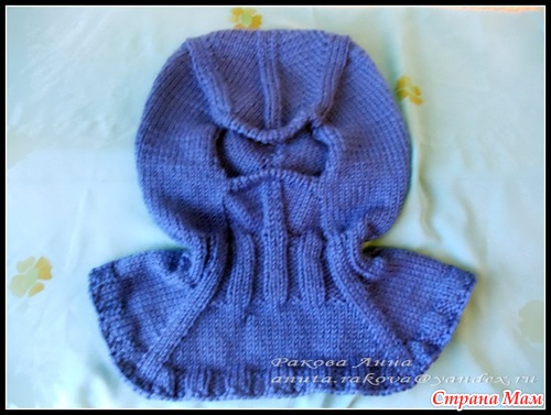 Именно этот вариант шлема связан без ушек. Если нужны ушки, то через 15 см. продолжаем вязать дальше (без укороченных рядов) вяжем еще 6 рядов (3 лицевых со всеми прибавками и убавками + 3 изнаночных) и сразу набираем петли из кромочных по 3 в каждом ряду.