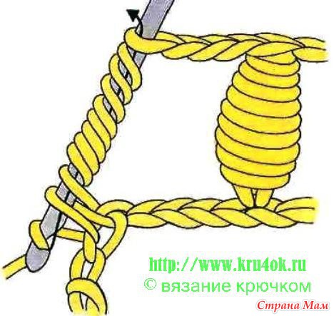 Протянуть нить через все петли на крючке. Прежде чем провязать петлю, её нужно ослабить.