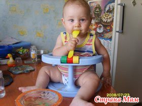 Но как же доверить годовалому малышу столь сложное и ответственное дело? Ведь он перемажется сам и перемажет всю кухню, да и разольет больше, чем донесет до рта! Конечно же, на первых порах именно так все и будет. Но ведь процесс воспитания вообще немыслим без определенных издержек! Чтобы минимизировать потери и разрушения, подложите под детский столик клеенку или кусок полиэтилена, а самого едока оденьте в очень удобный фартучек с рукавами, приобретите специальную тарелку на присоске, которую невозможно сбросить со стола, и удобную легкую ложечку.