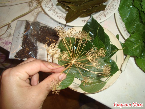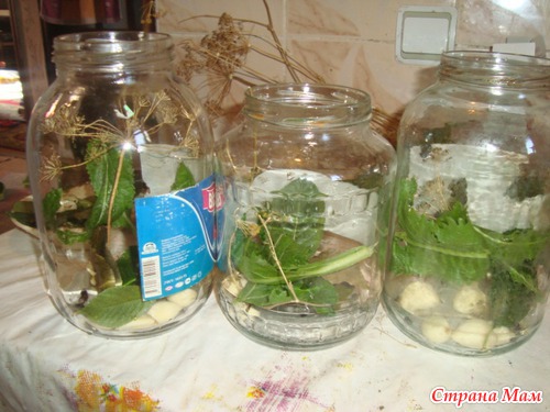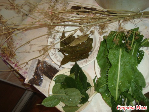 приготовим специи. горошки перец, соль, вишневые листочки, лавровый лист, траву-зонтики, хрен листочки