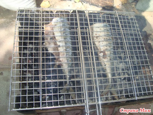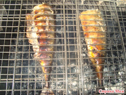 У меня грила нету, посоветовала мне автор идеи сделать все на мангшале. я 1 день промариновала рыбу в луке, в наршарабе, и сегодня на мангал. Правда был ветер и я целый час пыталась разжечь огонь и пол бутылку керосина израсходовала. ну я дама Настырная не отстала)))