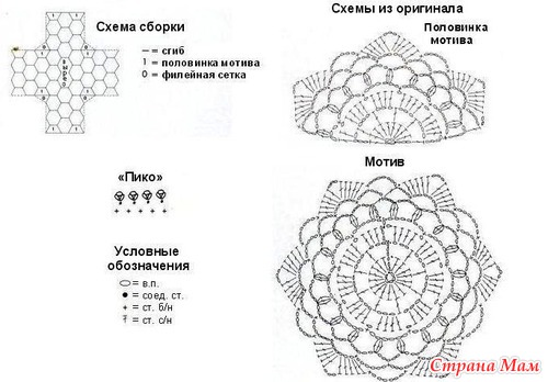 Описание работы: Связать 38 круговых мотивов и 8 половинок мотива, соединяя их друг с другом при вывязывании последнего ряда (см. схему сборки). Связав все мотивы, заполнить филейной сеткой соответствующие участки, указанные на схеме сборки. Обвязать низ рукавов и низ кофточки 1 рядом ст. б/н и 1 рядом «рачьего шага». Обвязать горловину 2 рядами филейной сетки и 1 рядом «пико».