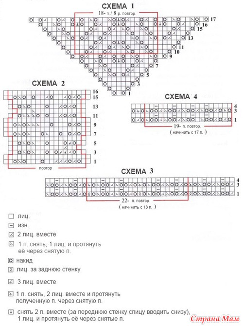 1-й круг. р.: [ 1-й р. по схеме 1, маркер, 1-й р. по схеме 2 (17 п. раппорта повторить 3 раза), маркер] вязать дважды (все что в квадратных скобках). Продолжить работу, повторяя с 1-го по 16-й р. по схеме 2 и до 17-го ряда по схеме 1 до достижения 184 п. Переходите на более длинные спицы, когда число петель увеличивается.