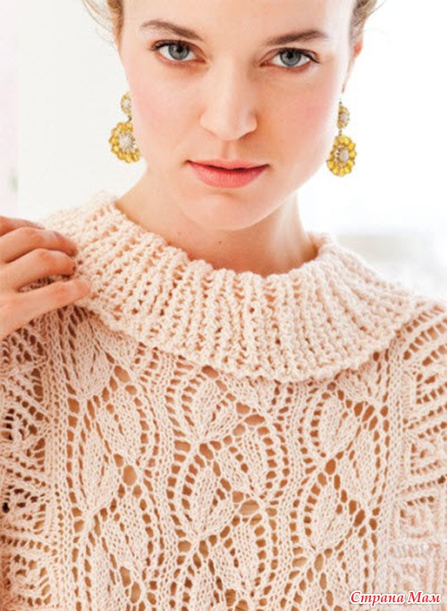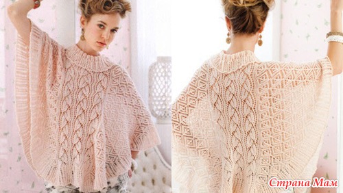 Необыкновенной красоты ажурное пончо с отложным воротником связано по кругу из пряжи нежного персикового оттенка.