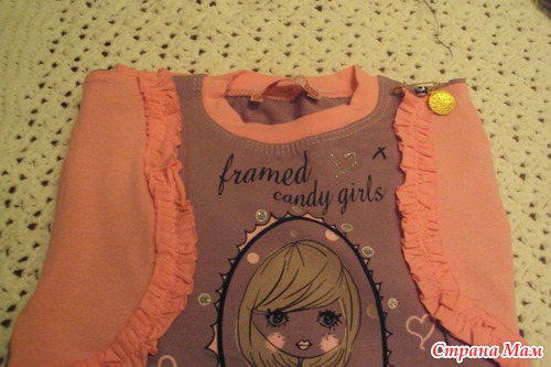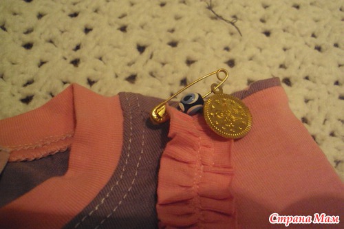 ульяшке очаровательная кофточка, а на кофточке булавочка с оберегом от сглаза и монеткой
