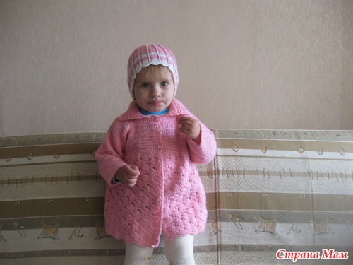 На фото 1 год и 7месяцев,от воротника до низа 35 см,только зачем вам эти сантиметры? я вязала пальто начиная от горловины к низу,сейчас дочка подросла и пальто стало немного коротковато,я собираюсь низ довязать на нужную длину и все.