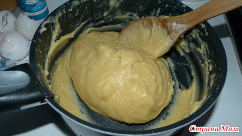 снимаем с огня и продолжаем мешать. Тесто должно чуть-чуть остыть. Как остынет по-одному вбиваем 5 яиц.
