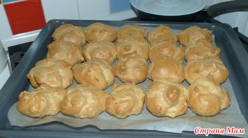 Эклеры готовы. Вынимаем их духовки. Ждем пока остынут. Это тоже не просто, но необходимо.
