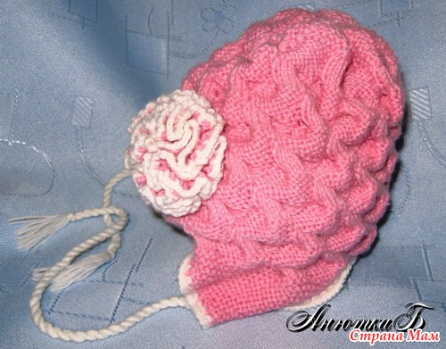 Начинать нужно с завязок набираем 4 петли и вяжем полой резинкой на высоте 20 см начинаем прибавлять с обеих сторон по 1-ой петле в каждом втором ряду (ушко у меня 28 петель), когда на спицах будет 6 петель начинаем вязать узор (схема есть у меня в альбоме https://www.stranamam.ru/photo/4093903/ ).