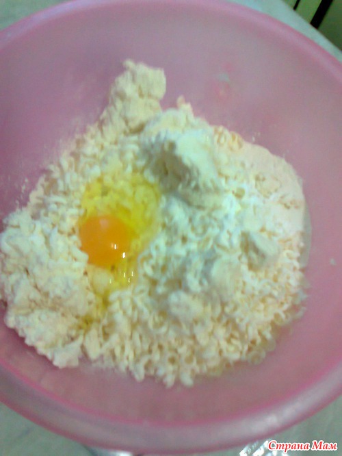 Добавим к тесту разрыхлитель, творог и яйцо. Вымесим не очень тщательно. Тесто должно оставаться эластичным, не тугим.