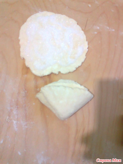 Итак, раскатанный кружок теста посыпаем сахаром и складываем его пополам. И эту половинку тоже посыпаем сахаром и снова складываем пополам! Таким образом, получается уголок из четырех слоев. Как видите, все очень просто!
