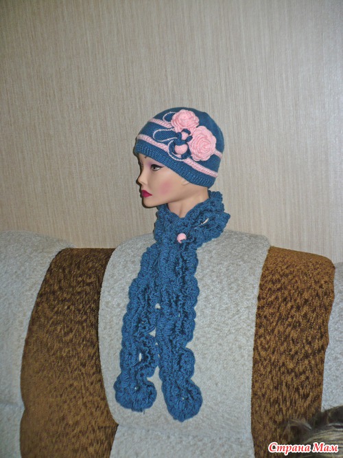 Новый комплект для дочки! Связано крючком. Уж очень хотелось попробовать цветочки связать(которые на шапочке). Ну и шарфик немного особенный! Вязала на вытянутых на линейку петлях.