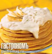 Приготовить соус. Бананы очистить, мелко нарезать. Сливки взбить с сахаром, добавить кусочки бананов и перемешать. Подать к горячим блинам.