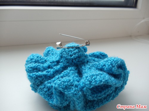 Как я ее вязала, схема простая. В кольцо набираем 25стн, 2р: увеличиваем в 2раза = 50стн, 3р: повторяем 2р = 100стн, и так до того момента пока вам не покажется достаточно. После того, как последний ряд будет связан, обрываем нить и прячем концы. Приступаем к вязанию задней части брошки, это круг нужного вам диаметра,( 2 в. п. в первую петлю вставляем нужное количество сбн, и вяжем по кругу до необходимого диаметра). Закрываем петлю и прячем конец. И так блинчик у нас готов, теперь пришиваем к лицевой части застежку для брошки( продаются в магазинах пряжи, швейных товаров, цена символическая рублей до 9)