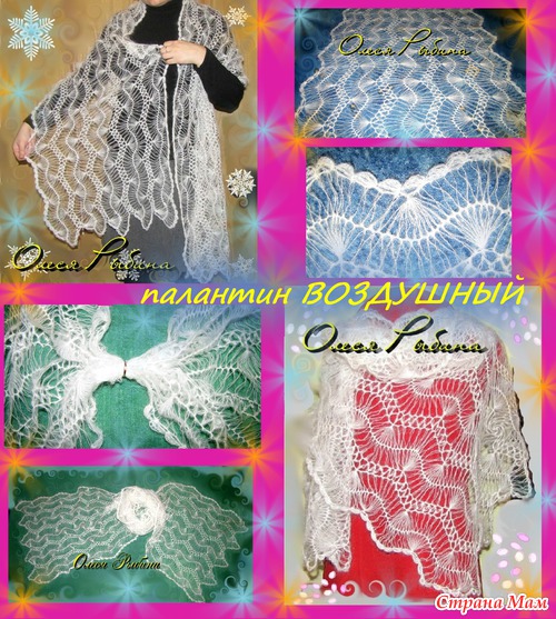 Смотрите, ну, ооочень воздушный получился! поэтому и назвала я его так же-ВОЗДУШНЫЙ. обсуждали тут https://www.stranamam.ru/post/4066145/?page=3#com26276808 размеры 2м на 54 см. нитки КИД-МОХЕР от ALIZE 25г 250 м,68% кид мохер,32% полиамид. вес 65 г, ушло 2,5 мотка. связан из 5 полос по 680 петель каждая. полоса собрана в ракушки по 10 петель(на схеме нарисовано 12), соединение соломоновыми петлями. ну и обвязка еще. сразу скажу про нитки, осталась не совсем довольна-"лезут" и при вязании нить неравномерная- то голая, то намотано много.