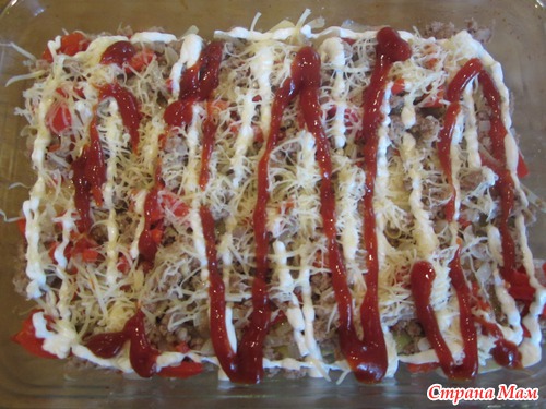 сдобриваем майонезом + кетчуп+ тертый сыр