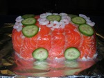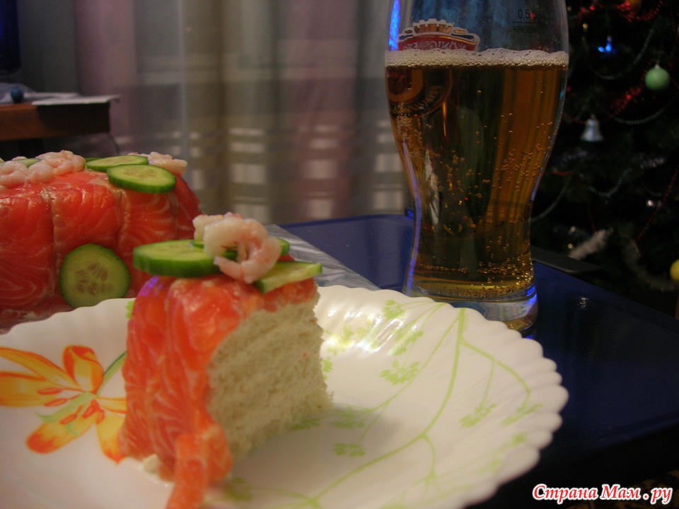 Когда уложен последний слой,края тоже лучше смазать.Сверху закрываем все красной рыбкой,украшение на ваш вкус