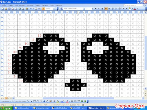 Для построения рисунка нам потребуется текстовый редактор (Word, OpenOffice или др.), в котором есть функция построения таблицы. В редакторе строим автоматически таблицу с заданными размерами ширины столбца 0,7 см, число столбцов 38. Число строк 30. Теперь мы имеем сетку петель приблизительно в натуральную величину, на которой можно нарисовать любой рисунок, какой вы хотите! В нашем случае это будут глаза Панды. Нужно только учитывать, что в готовом изделии рисунок будет несколько меньше, т. к. площадь петли меньше, чем площадь ячейки в таблице! Рисуем способом заливки ячеек цветом.