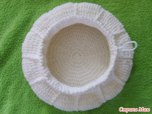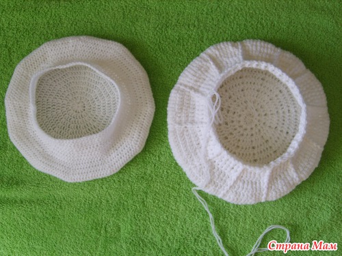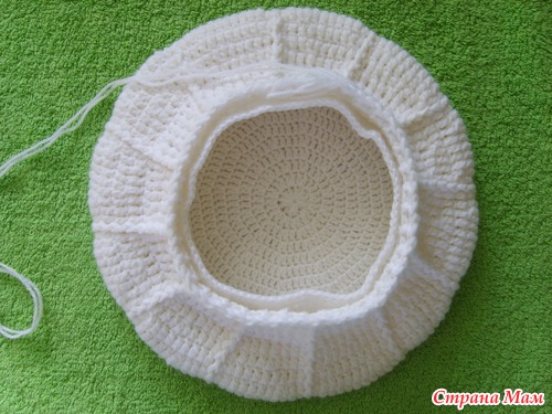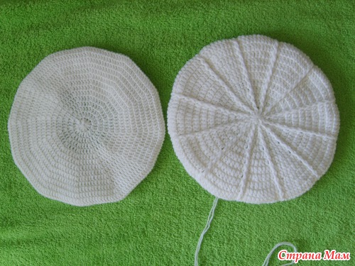 Затем вяжем подклад-это ещё один берет, немного меньше первого. В процессе вязания примеряем, вставляем внутрь, чтобы не промахнуться с размером. Подклад вязала столбиками с 1 накидом. Блинчик вязала по схеме( та, что с права), до нужного диаметра, затем выполняла убавления, в каждом клине по 2 петли провязывала вместе.
