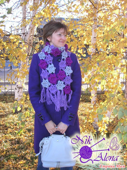 . К осеннему пальто связала вот такой цветочный шарфик, вяжется он очень просто, но в тоже время, как мне кажется, это очень красивый и стильный аксессуар.