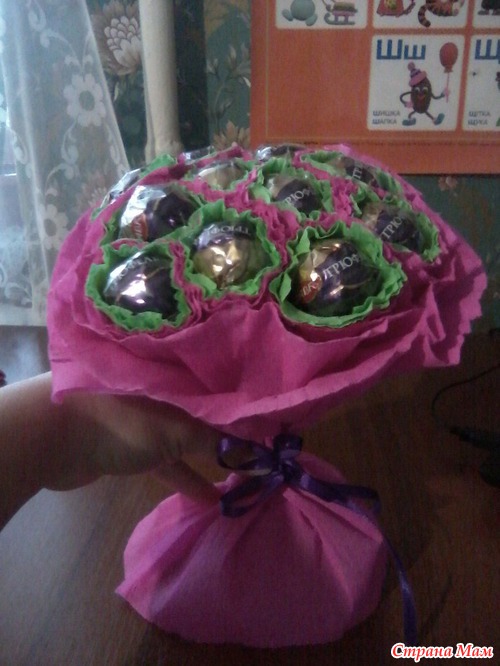 Захотелось мне попробовать сотворить букет из конфет. Все, что делаю первый раз для меня очень страшно , но глаза боятся, а руки делают.