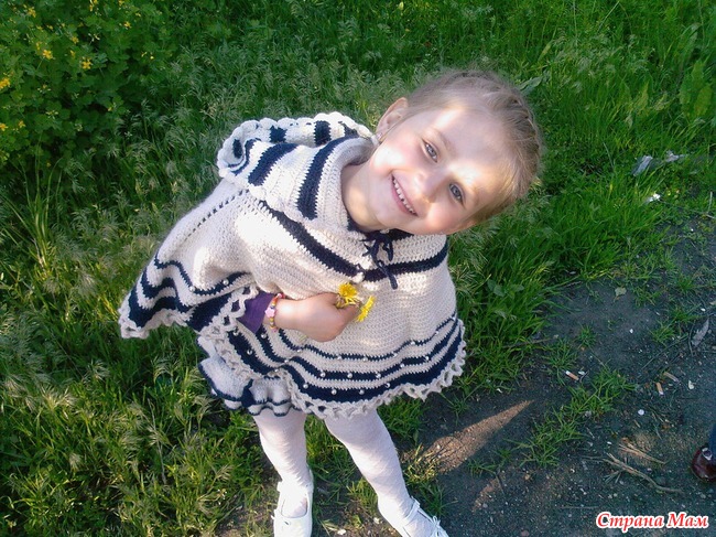 Извините, но не могу найти фото в полный рост, а сейчас сфотографировать нет возможности, т.к. фото с телефона, а если фотографировать в помещении - качество плохое. Я вязала пончо по квадрату с бусинами. Юбка прямая с двумя воланами.