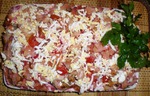 Приготовил салат с красной рыбой : семга и лосось . Не знаю , как на вкус ( гости вынесут вердикт ) , но уже в ъхолодильнике , ждет своего часа , как и плацынды медленно готовятся в духовочке .